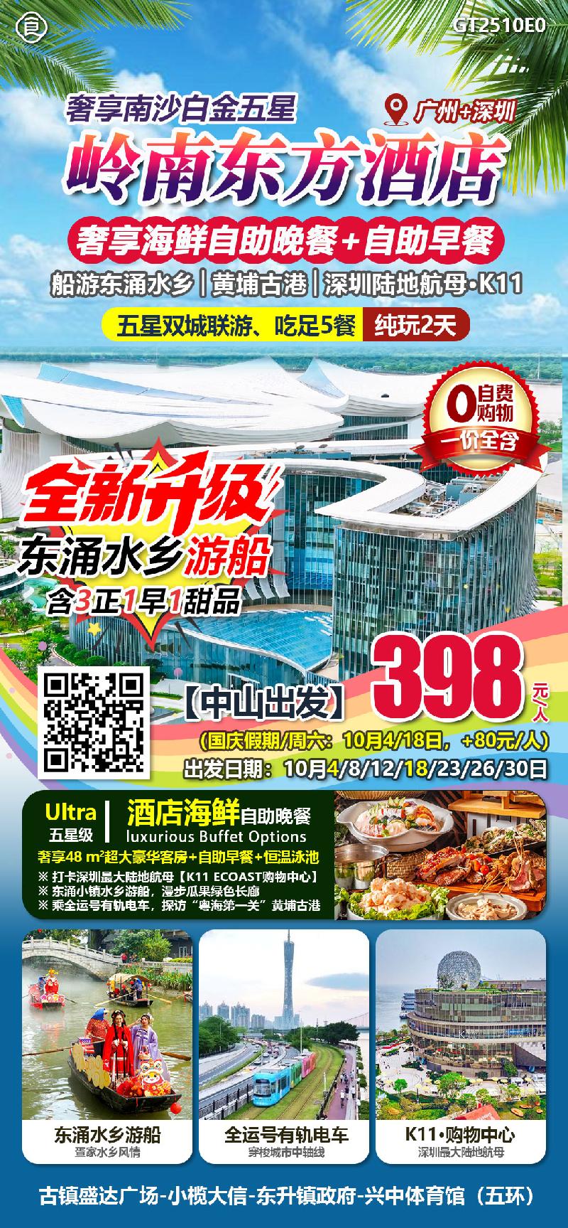 3. 住宿:南沙岭南东方酒店(大床房/双床房,随机安排)(具体房型按酒店安排为准,酒店不允许三成人同时入住,酒店不设三人房,不可加床,不设退房差,单成人需补房差)请游客出发当天携带身份证原件(或户口薄)等有效证件,以便办理入住登记手续!(酒店必须身份证实名登记入住)