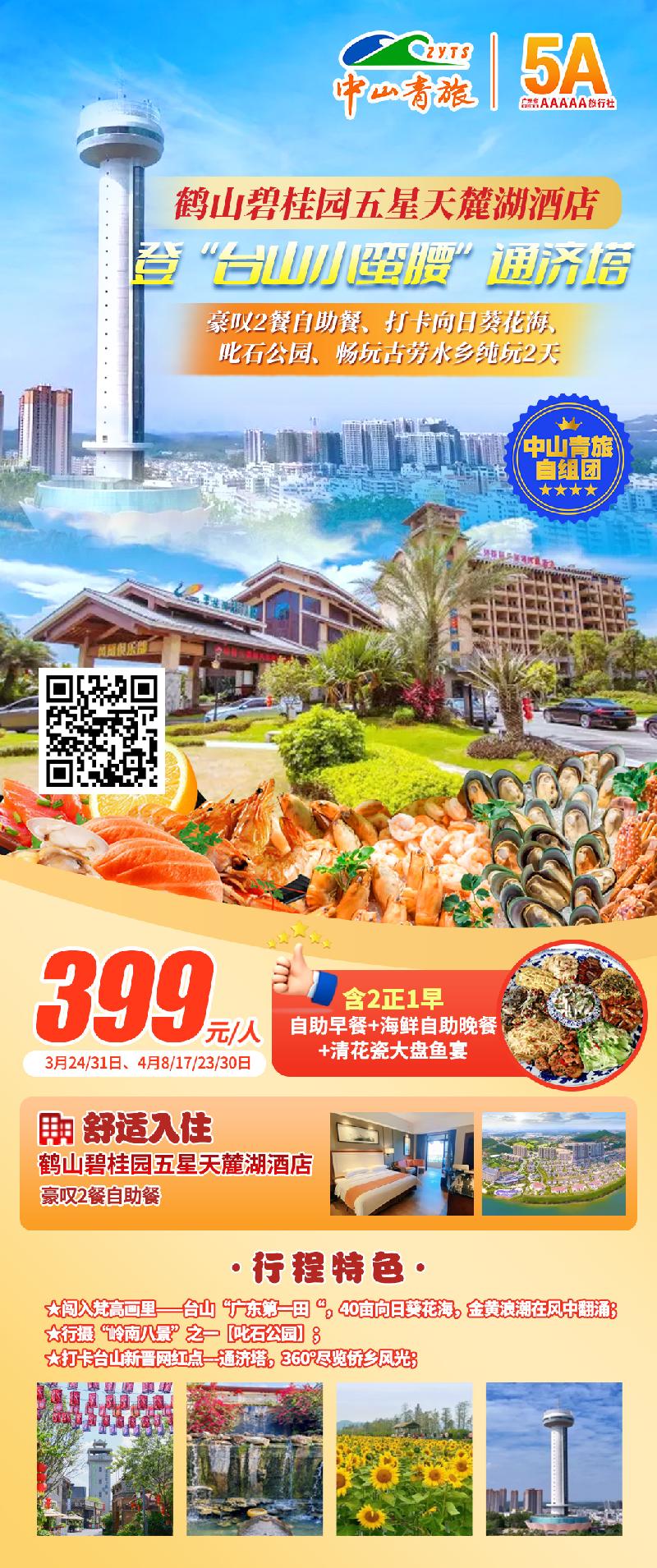 2、住宿:含1晚鹤山天麓湖碧桂园凤凰酒店,酒店房型为大床/双床,补房差200元/人,不设单男单女,不设三人间;