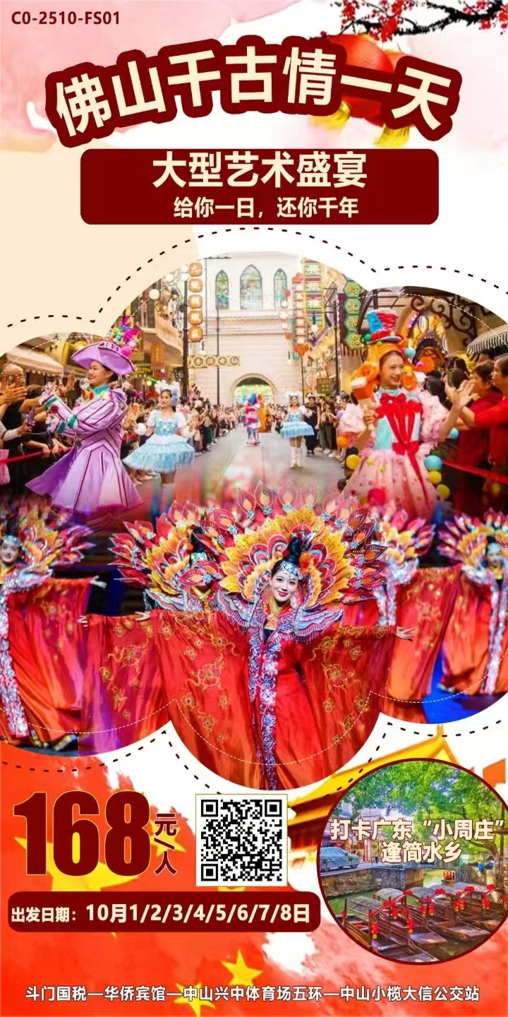 4.门票:含【广东千古情】第一道大门票;(西樵山大门票免费,若遇景区政策需要收费,旅行社有权更改去其他免费景点,请知悉)