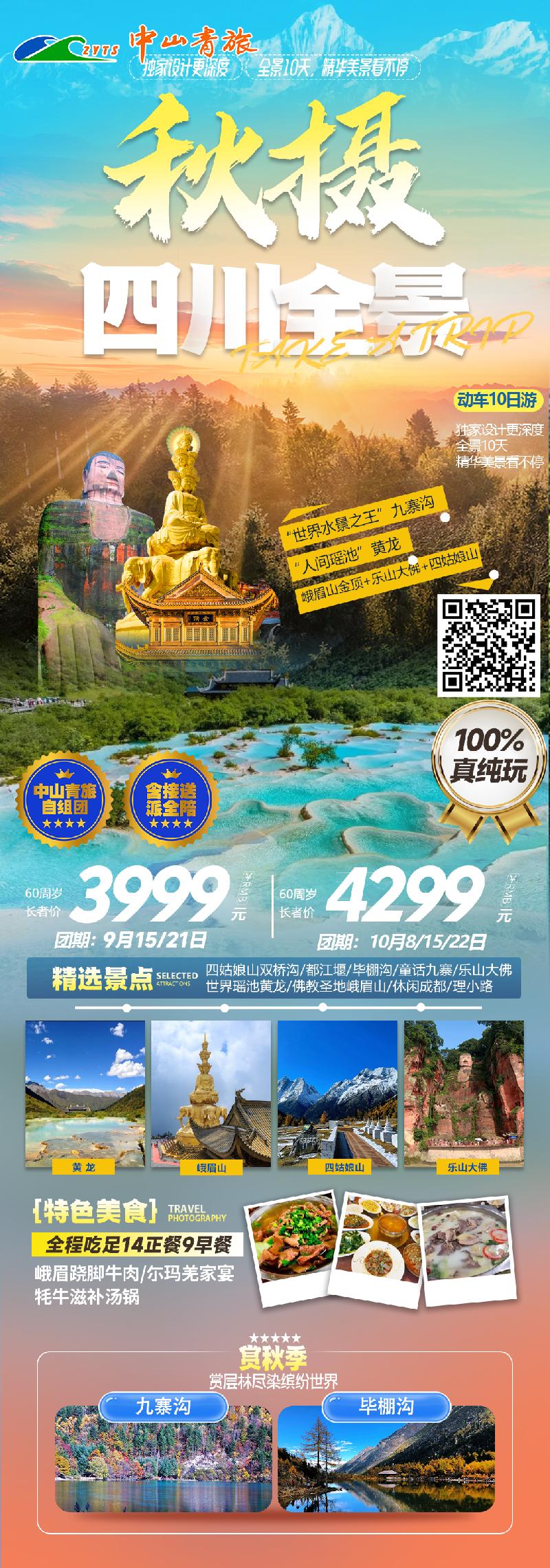 四川四姑娘山双桥沟、都江堰、毕棚沟彩林、米亚罗红叶、理小路、童话九寨沟、世界瑶池黄龙、佛教圣地峨眉山、乐山大佛、休闲成都动车10天100%真纯玩团